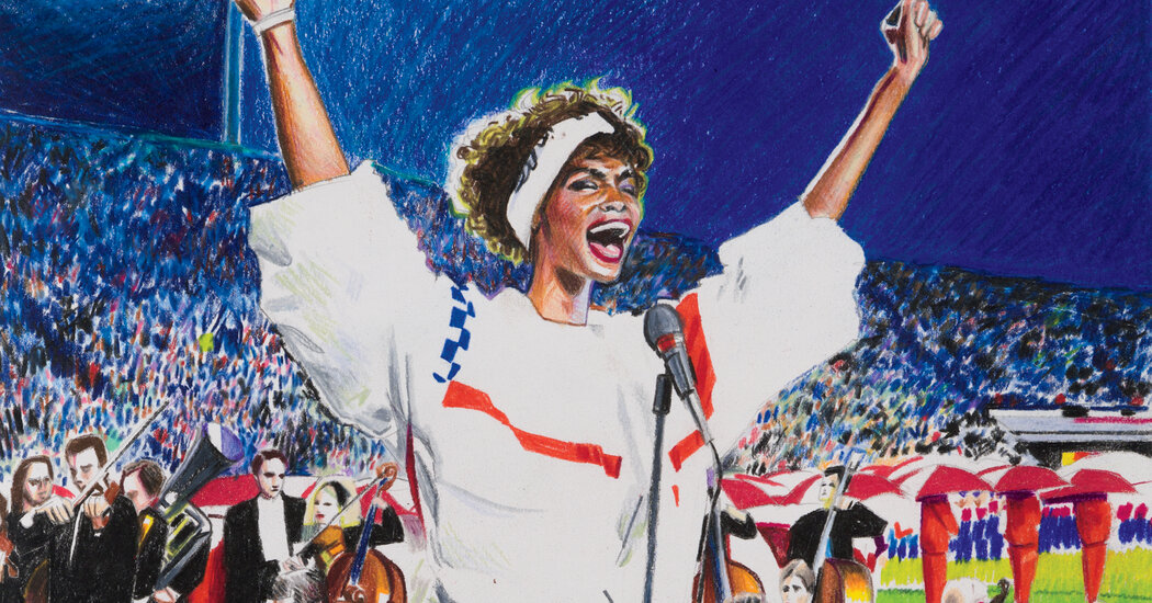 Pentru a insoti acest eseu, artistul american Sam McKinniss a creat pictura in ulei „Whitney Houston” (2022) in exclusivitate pentru T. „Houston a fost cea mai talentata cantareata din lume cand era in viata”, spune McKinniss. „Aceasta nu este o exagerare. Ocazional am facut picturi si desene cu ea pentru a incerca sa inteleg semnificatia acestei pozitii. Sa ai o voce in America nu este o fapta mica, sa nu mai vorbim de cea mai buna.” Credit… Cu amabilitatea artistului, JTT si Almine Rech. Foto: Charles Benton.